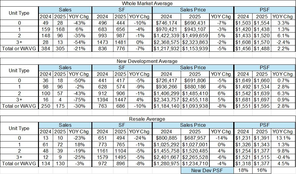 The average price per square foot premium for new development units as compared to resale units was 16% in 2025 (New Dev $1,595 PSF v. Resale $1,377 PSF)